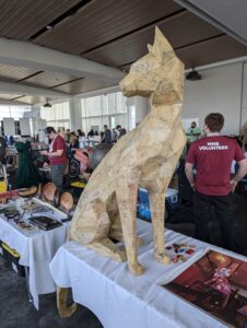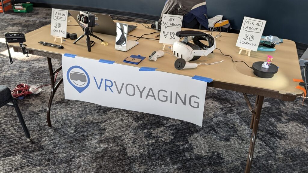 The VR Voyaging booth was all about learning with signs asking visitors to “Ask me about” technologies including 3D cameras, 3D scanning, and VR. I showed off the Fujifilm FinePix Real 3D W3 point-and-shoot camera, the Calf 3D VR180 camera, the Looking Glass Go holographic 3D display, the Meta Quest 3 VR headset, the Revopoint Miraco standalone 3D scanner, and a few other toys. I took a few head scans of folks who wanted to see how scanning worked, and created a reel of 3D content to cycle on the display which always elicited a double-take.