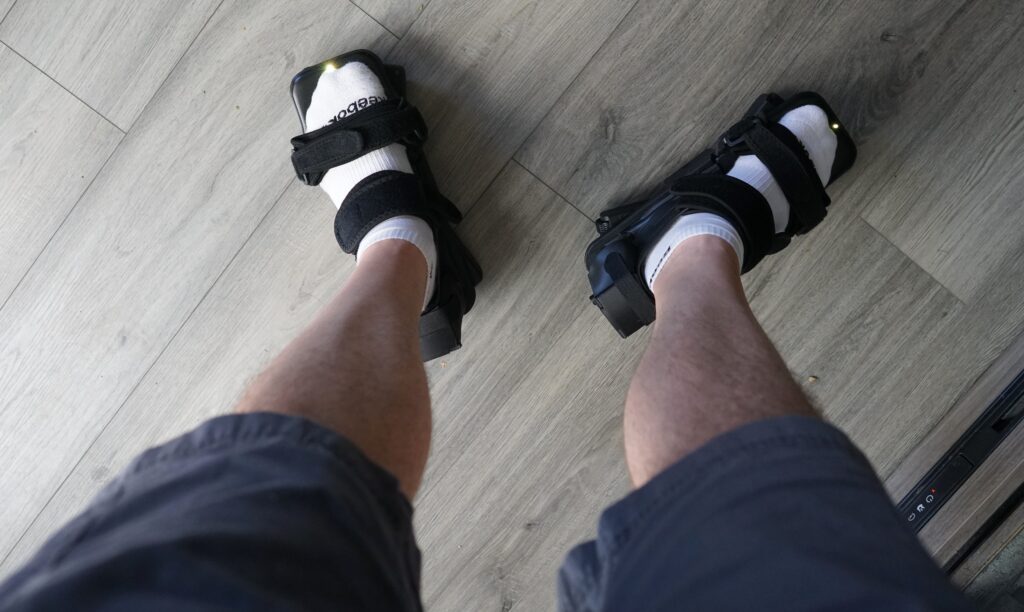 The shoes work with any SteamVR-supported VR headset and most PC VR games that have walkable environments. Freeaim’s intention is for them to eventually pair like a gamepad to work with any headset, including the Meta Quest, by mimicking a directional pad. While you can move in different directions, speed isn’t fully supported (just walk for now), and you cannot go backward currently. The technology also includes “Positional Correction,” an innovative feature that helps users stay centered in their playspace, ensuring a natural walking experience.